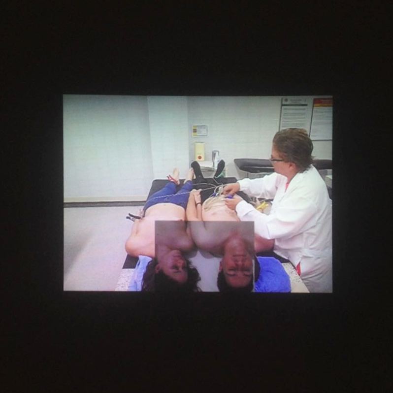 Toma de electrocardiograma experimental, en el Laboratorio de Fisiología de la Dra. López Marmolejo, mi mamá, quien es médica deportologa, con ayuda de su auxiliar, en la Universidad Libre de Cali. Realicé este performance junto con Luis Felipe Vélez, mi pareja sentimental, sometiéndonos a diferentes exámenes que ponían a prueba la sentencia “dos corazones que laten como uno”. En el vídeo logra notarse cómo la máquina comienza a emitir unos sonidos indicando que algo extraño está ocurriendo, confundida de los datos que registra. La intención con esta obra es precisamente, confrontar la verdad del arte con la verdad de la ciencia.