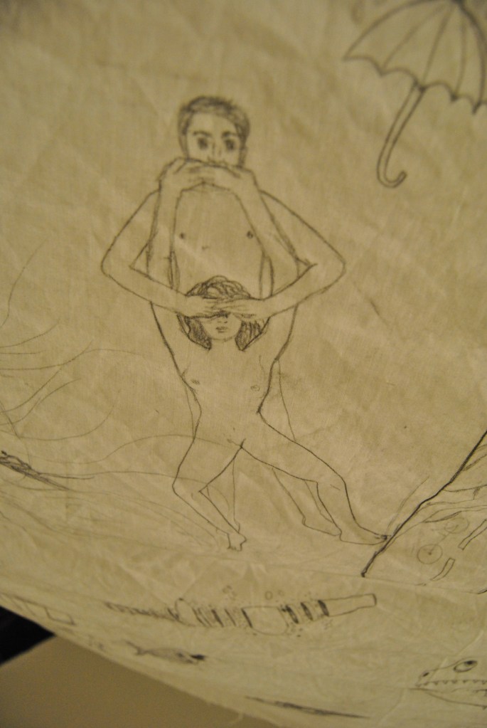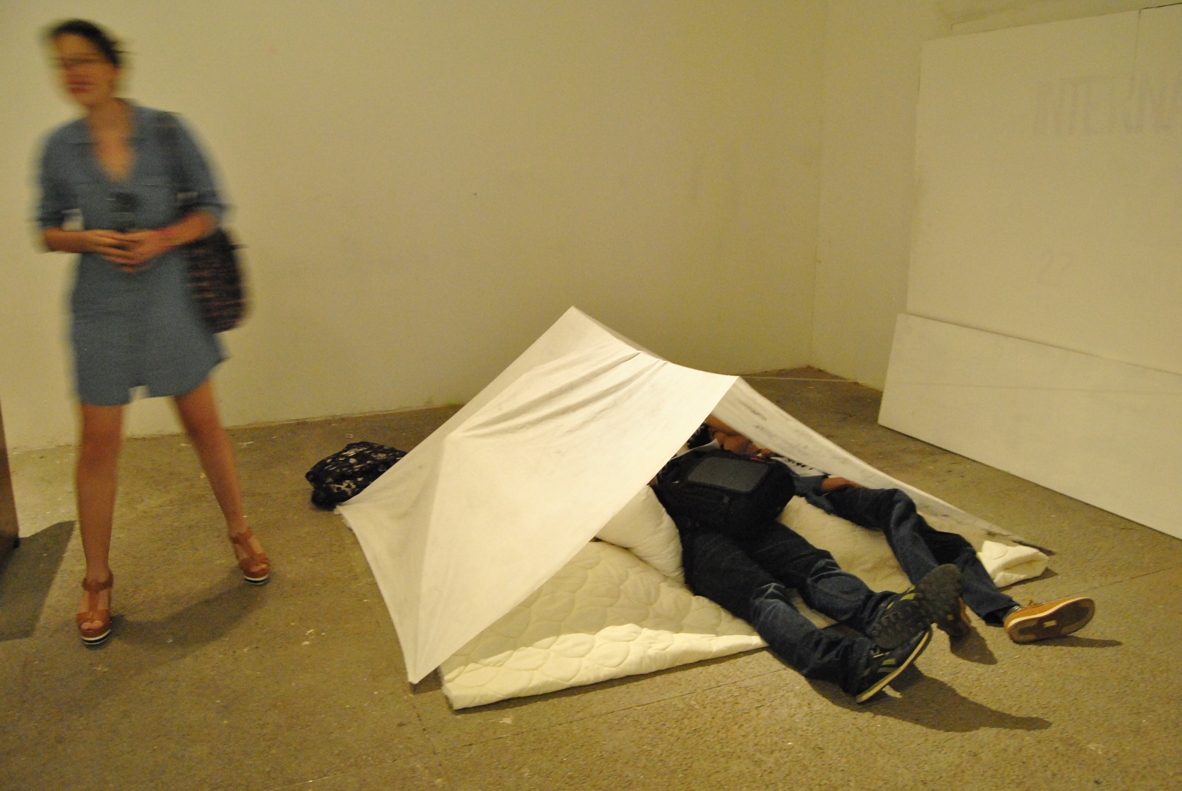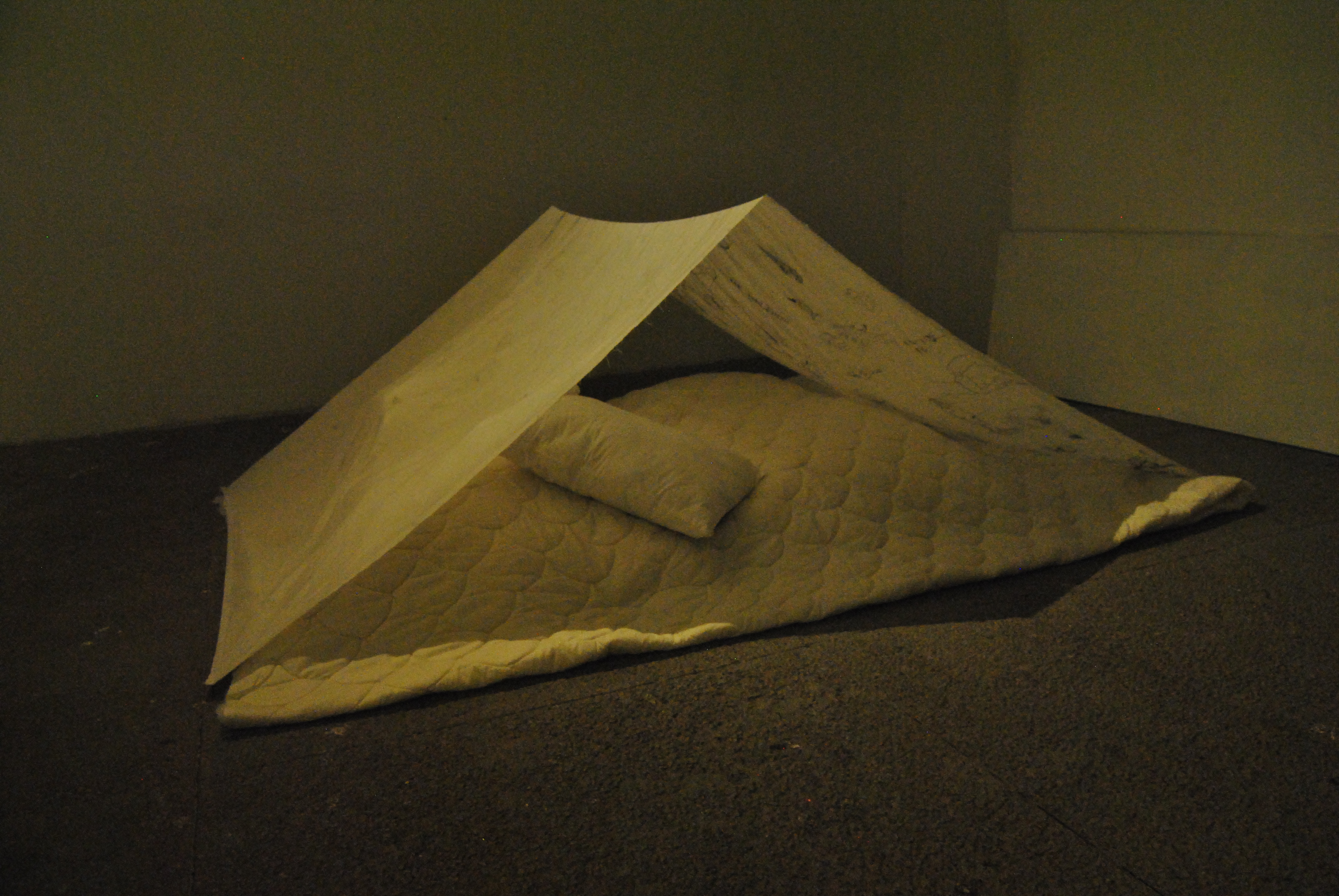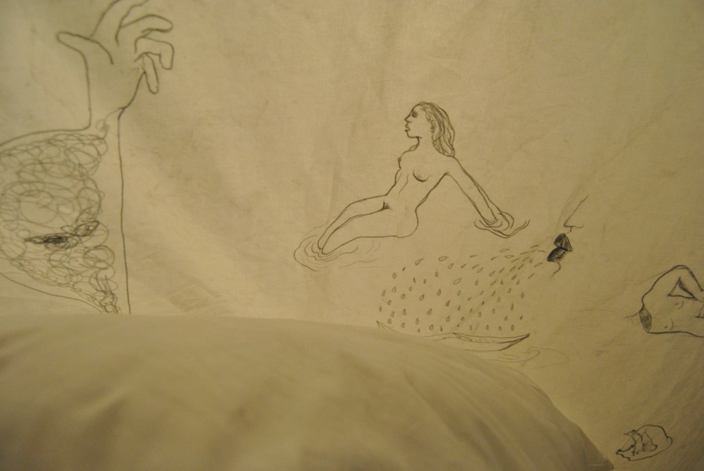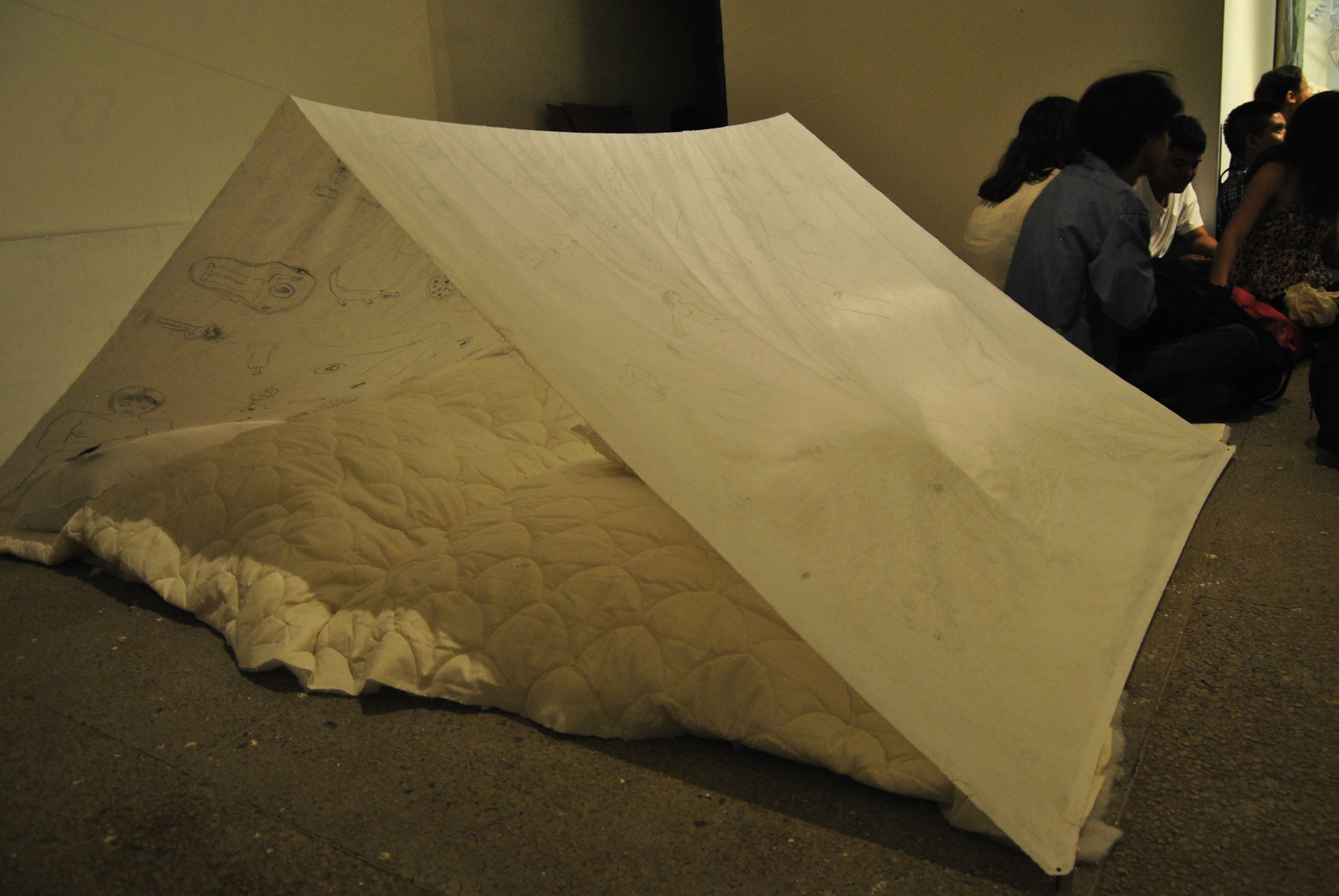 En forma de carpa, instalé una sábana previamente intervenida con dibujos a lápiz, después de tener intimidad usando aceite corporal que impregnó transparencia y olor al textil. Los dibujos fueron realizados automáticamente, evocando la técnica surrealista. Para el montaje se vinculó al público asistente que voluntariamente quisiera compartir este espacio de intimidad, invitandoles a adentrarse.